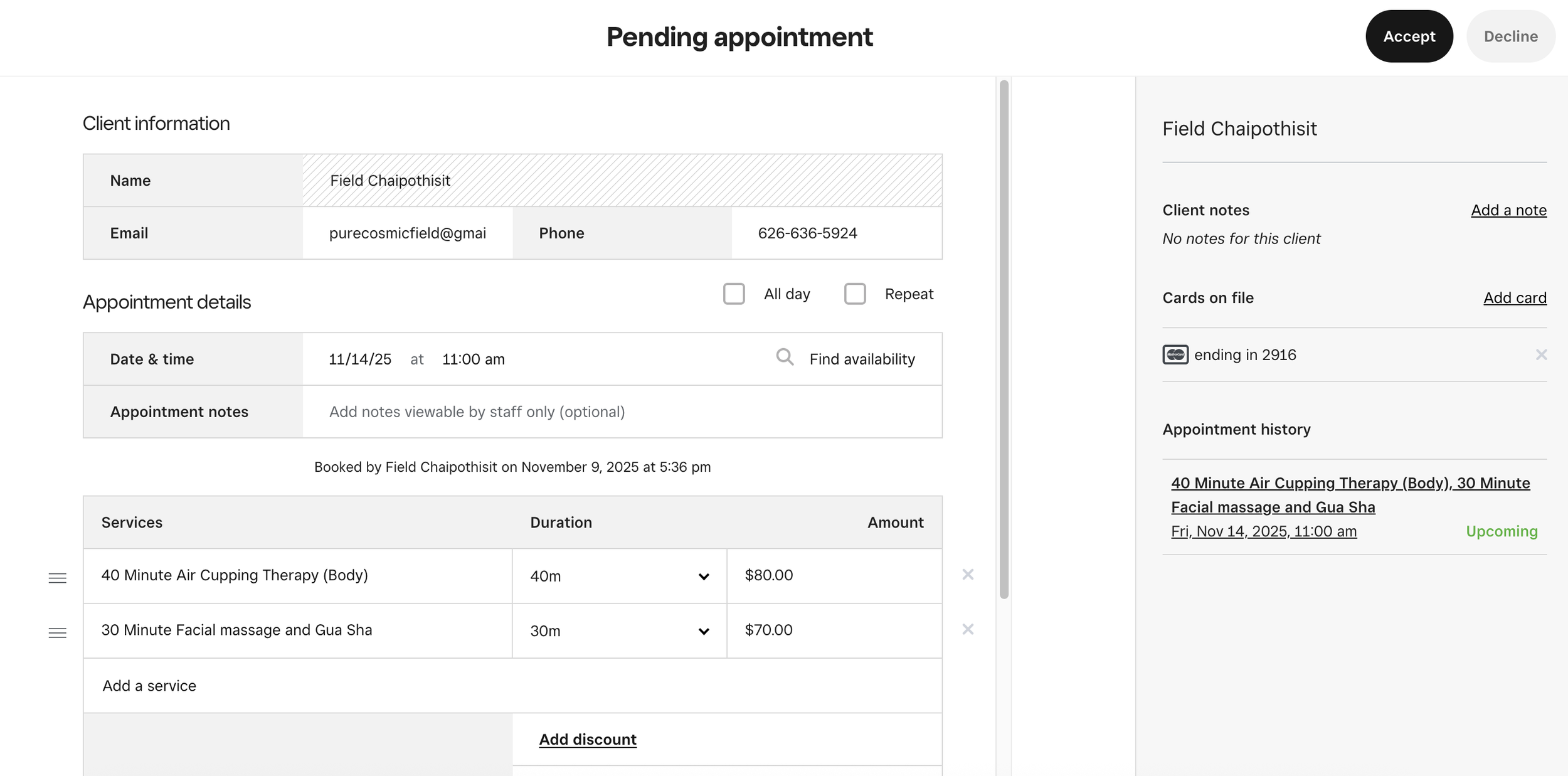 Clients booking services