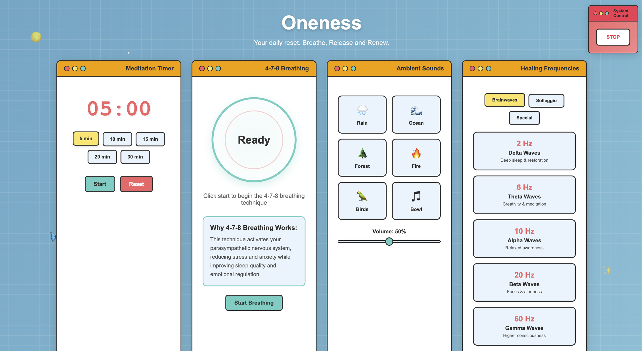I used to have to open multiple websites, adjust settings, and piece together the right sounds every time. Oneness streamlines my workflow by bringing timers, breathing exercises, ambient sounds, and healing frequencies into one unified experience.